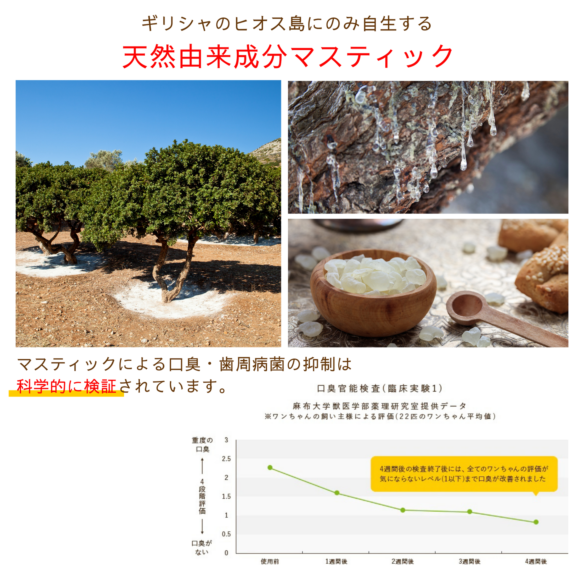 その研究結果から、マスティックが犬特有の歯周病菌(P.gulae)に対して抗菌効果があること、また口臭の原因物質を減少させることが明らかになりました。
